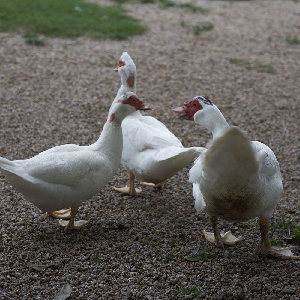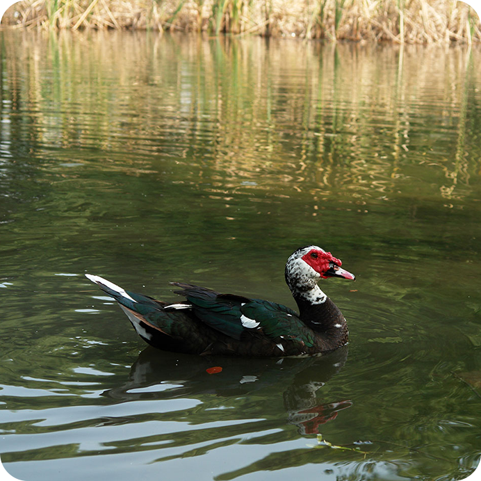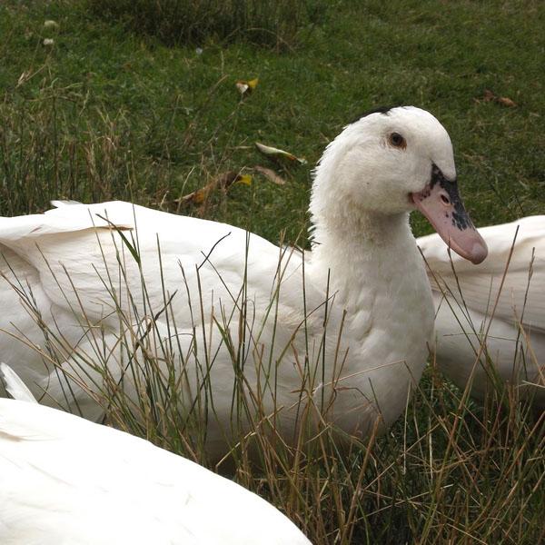 Chinese Muscovy Duck has a fusiform body shape, medium head, short and narrow duckbill. At the bottom of the duckbill around the eyes it has red or black balls, and a small ball at the bottom of the upper duckbill. The male duck is stronger than the female duck. On its head there is a row of long feathers, which will rise up if the duck is stimulated. It has wide chest and soft abdomen. It has long feathers on its tail, long wings that are able to reach its tail, short but strong legs. Normally it has black and white plumages, only a few ducks have silver grey color and russet color plumages.。
